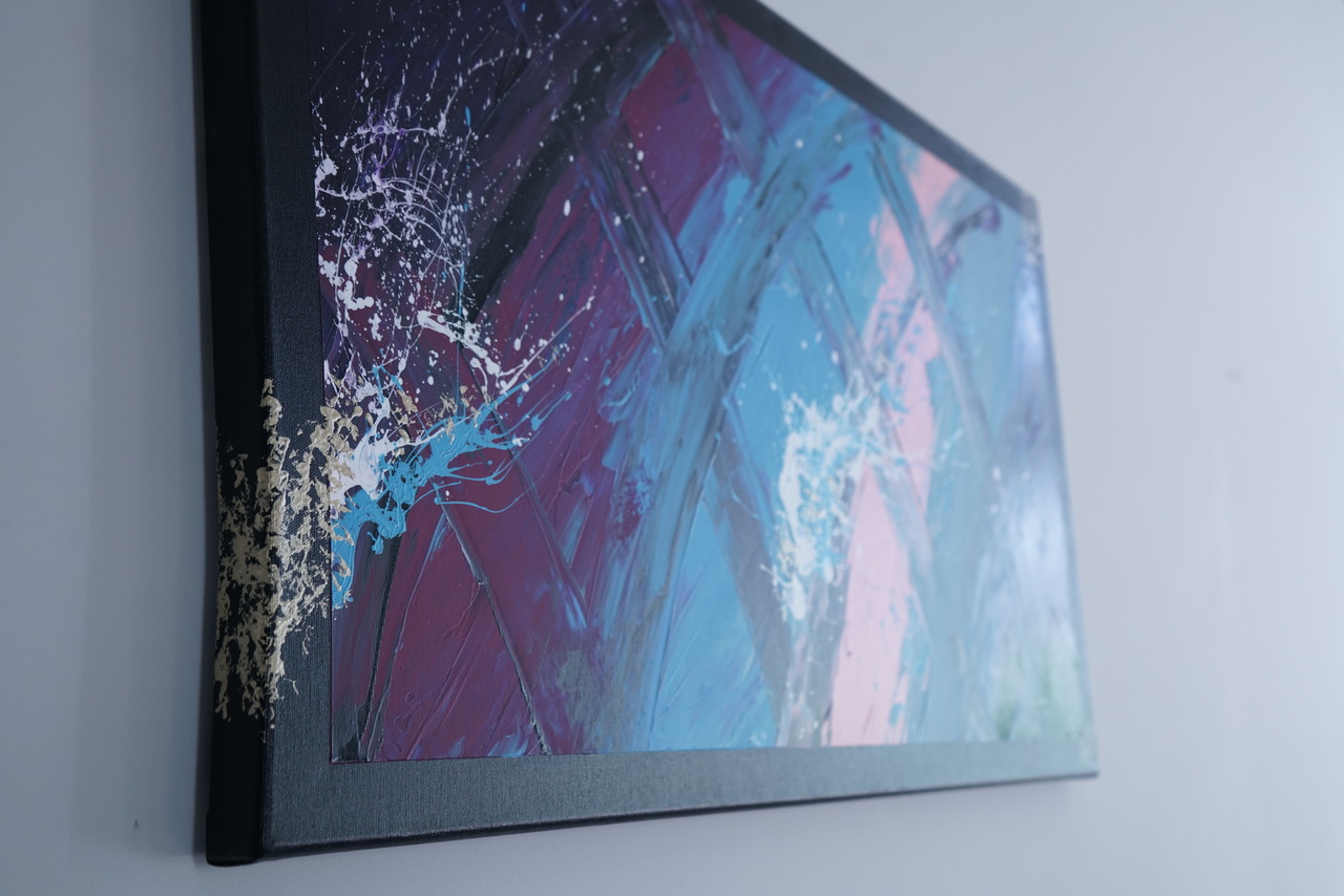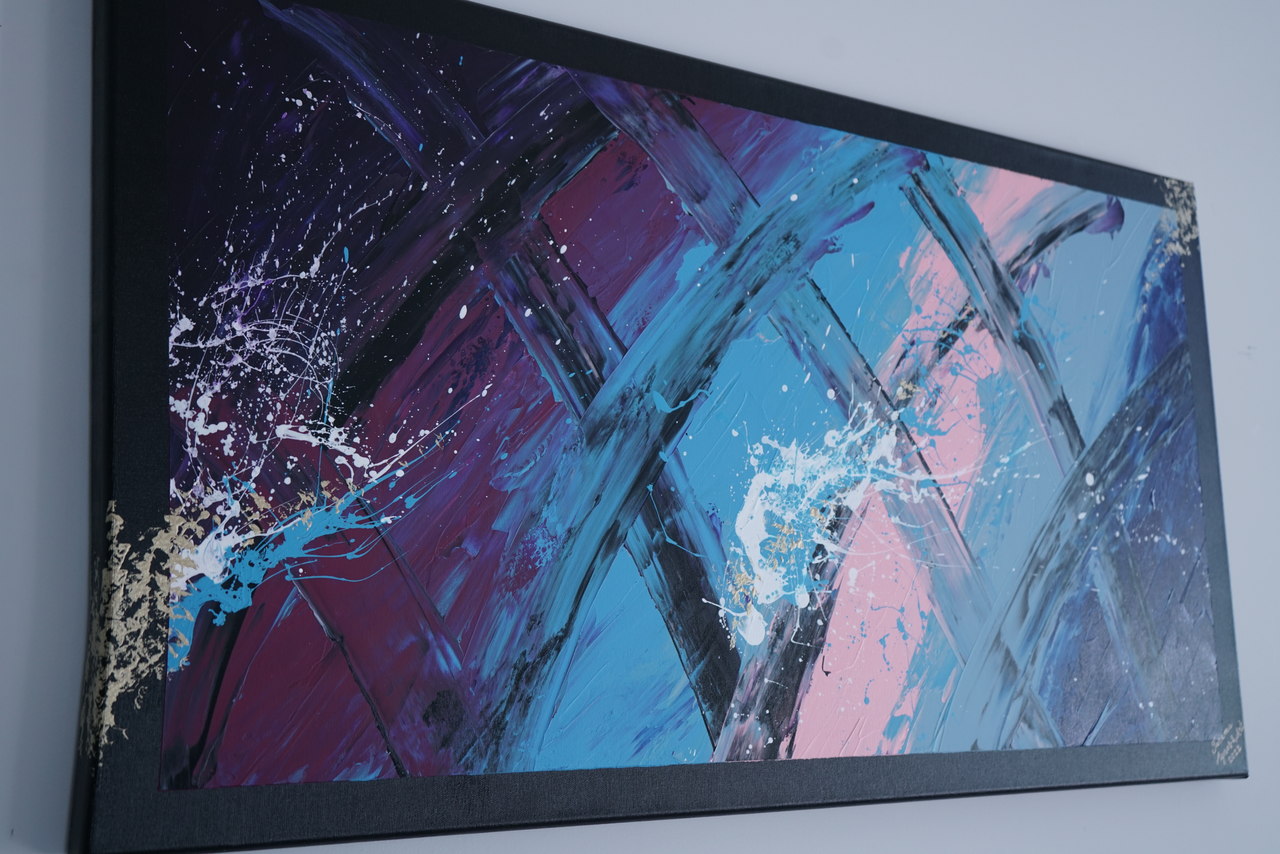 Obraz namalowany farbami akrylowymi w odcieniach fioletu, błękitu i złota o wymiarach 60cm x 120 cm. Czarna opaska imitująca ramę obrazu, gotowy do powieszenia.