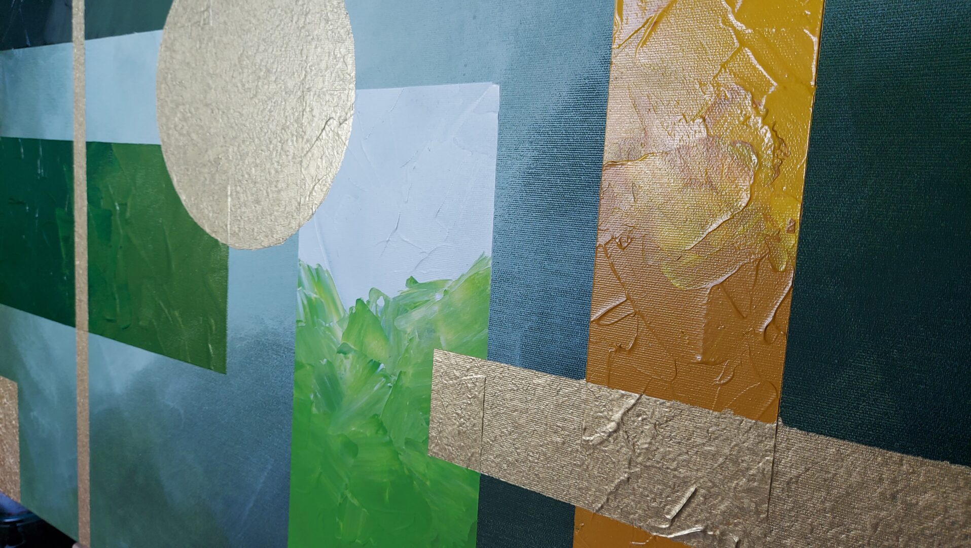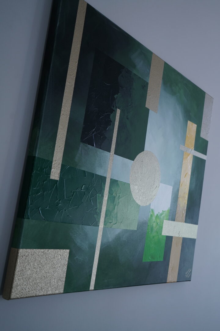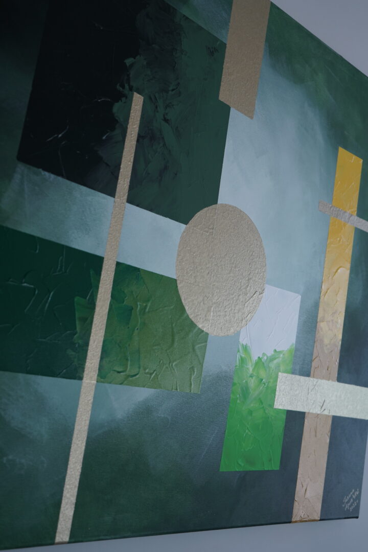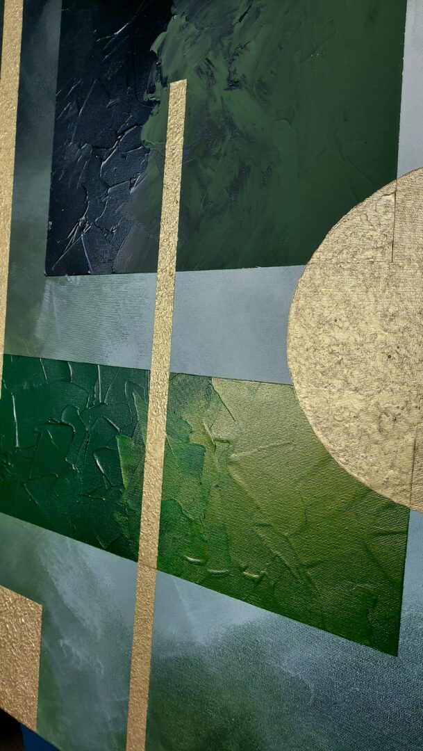 Obraz o charakterze geometrycznej abstrakcji wykonany farbami akrylowymi w pięknych odcieniach soczystej zieleni i złota. Wymiary 100cm x 120cm.