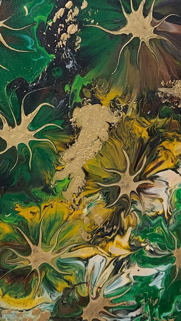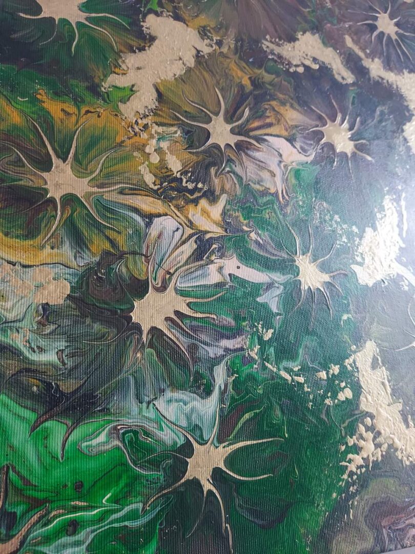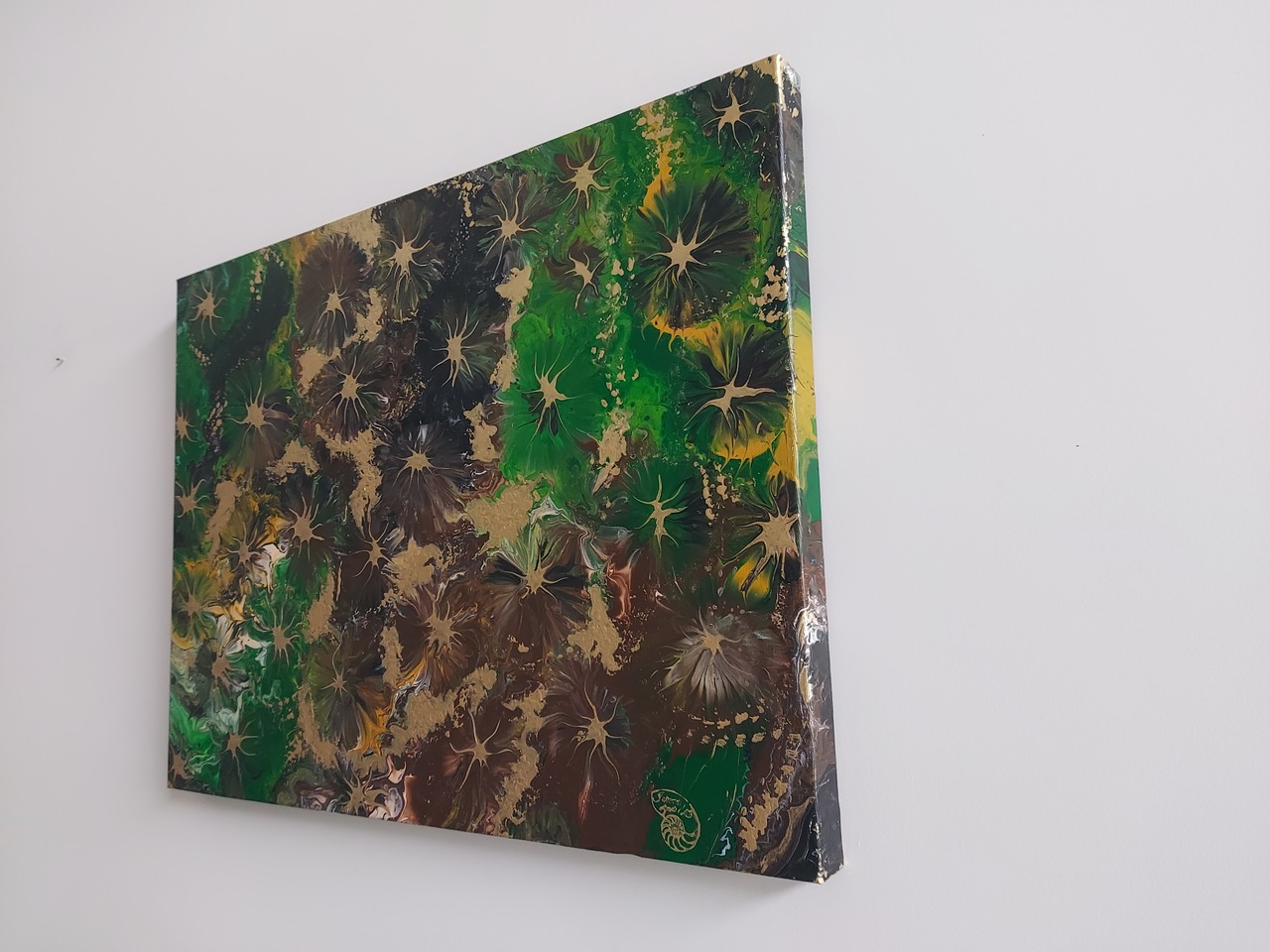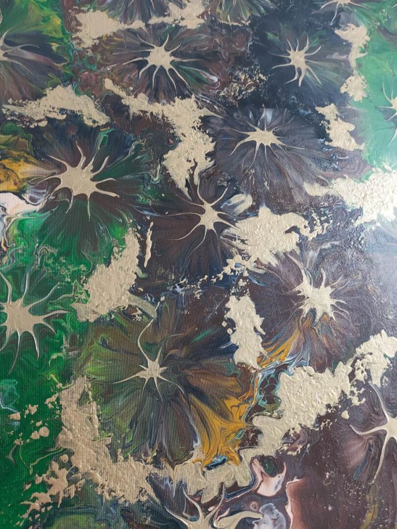 Obraz o wymiarach 60cm x 80cm x 4cm ,  wykonany farbami akrylowymi o charakterze abstrakcji w kolorach zieleni, brązu i złota, gotowy do powieszenia w poziomie lub pionie.