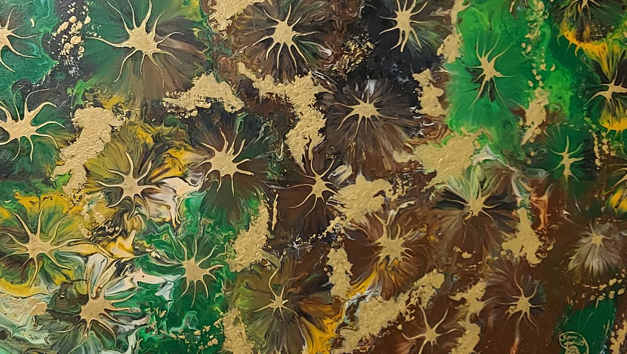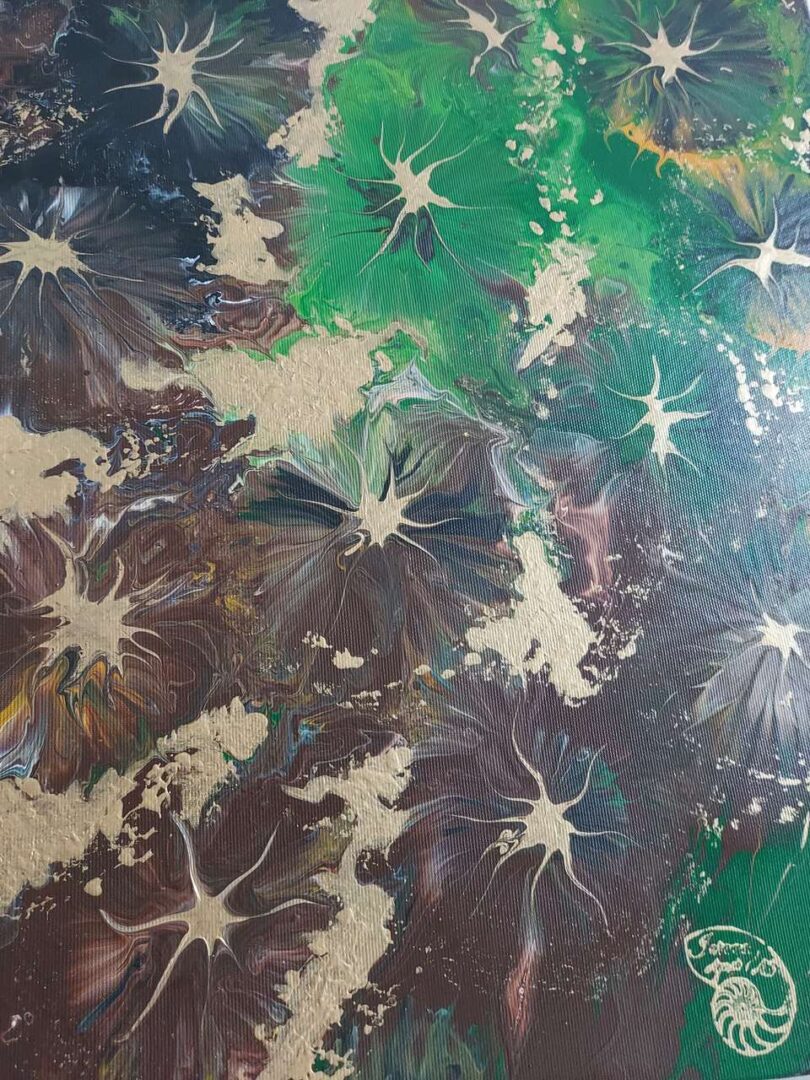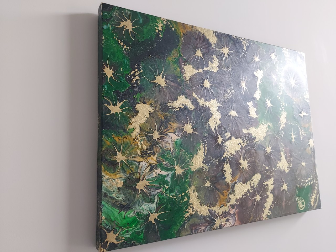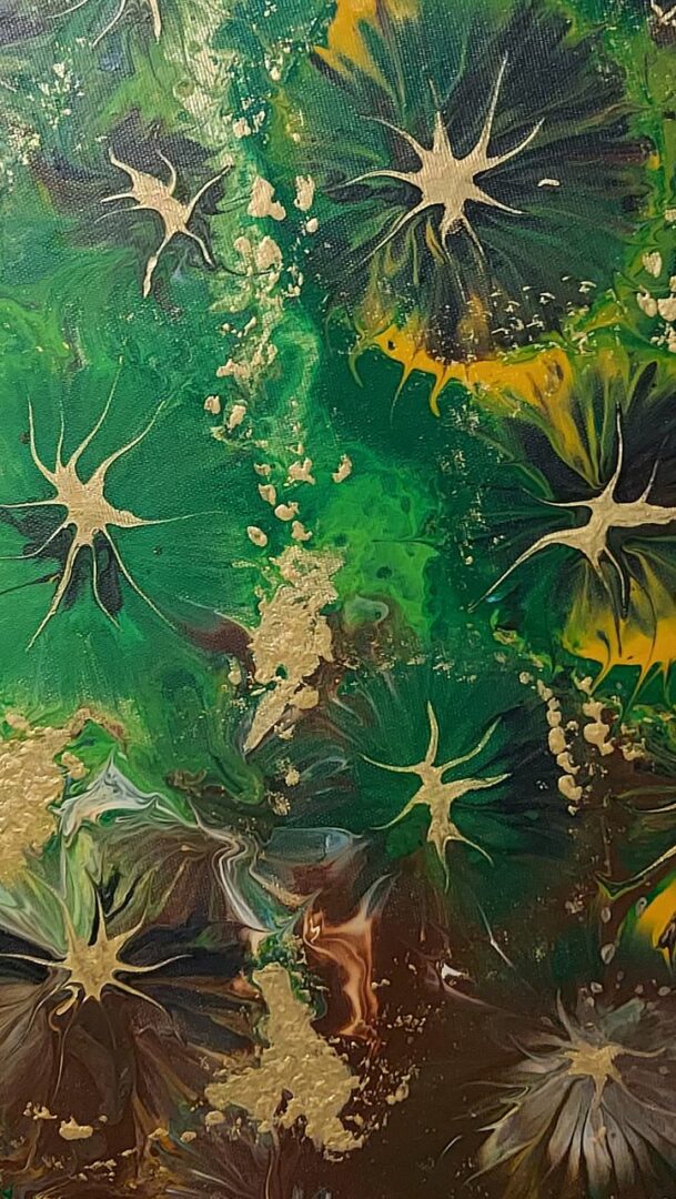 Obraz o wymiarach 60cm x 80cm x 4cm ,  wykonany farbami akrylowymi o charakterze abstrakcji w kolorach zieleni, brązu i złota, gotowy do powieszenia w poziomie lub pionie.