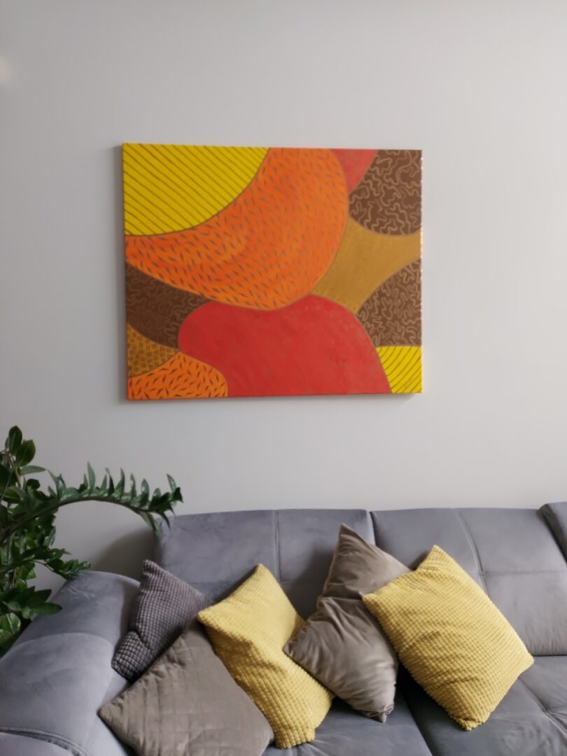 Obraz na płótnie o wymiarach 100 cm x 120 cm x 2 cm , wykonany farbami akrylowymi w pięknych pomarańczowych, czerwonych, brązowych i złotych kolorach, które cudownie ożywiają pomieszczenie i nawiązują do naszej polskiej „złotej jesieni”. Obraz jest gotowy do zawieszenia ale jest też możliwość na życzenie klienta oprawienia obrazu w drewnianą ramę jak np. obraz „Nadzieja” lub ” Wir wszechświata”. Oferowana cena nie zawiera dodatkowego kosztu ramy.