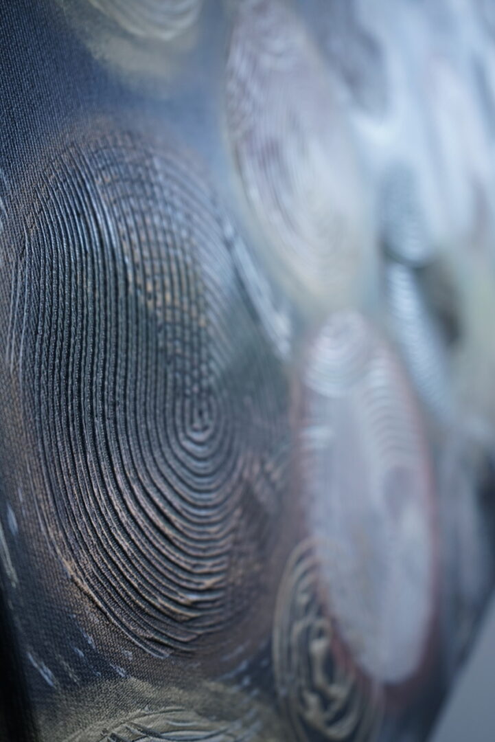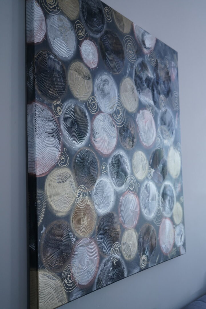 Duży, oryginalny, abstrakcyjny obraz o wymiarach 120cm x 120cm x 4cm wykonany ręcznie farbami akrylowymi w kolorach czerni, srebra, białego, żółtego i złota. Inspirowany przyrodą, a konkretnie energią pszczół. Boki zamalowane, obraz gotowy do powieszenia.