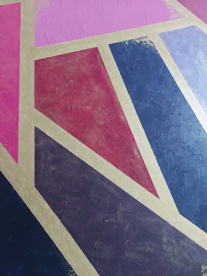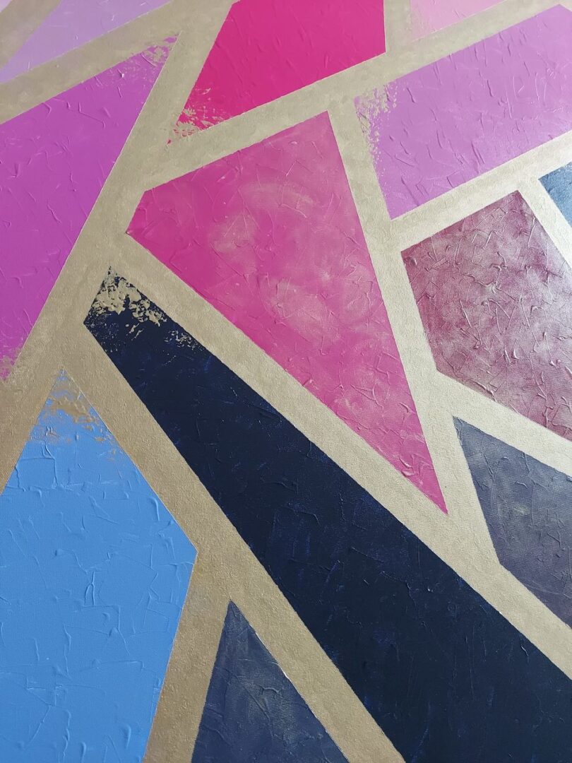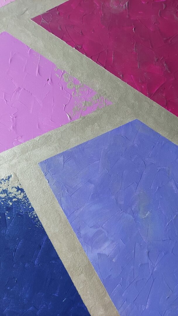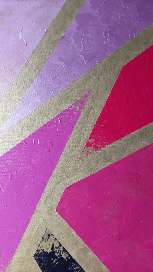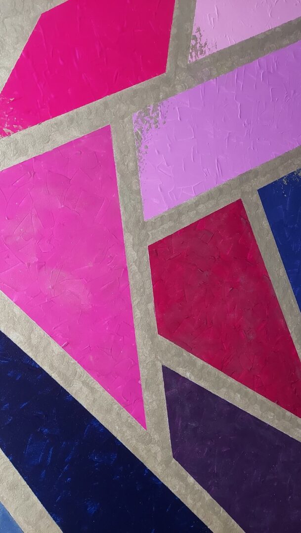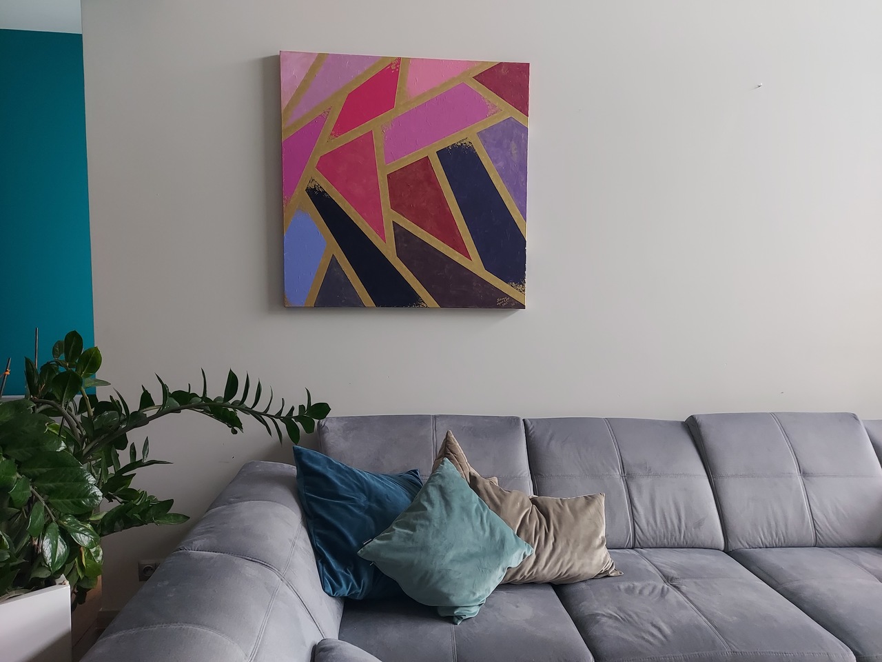 Abstrakcja ” Trójkąty ” o wymiarach 100cm x 100cm x 4cm w pięknych odcieniach różu, czerwieni i fioletu, wykonana farbami akrylowymi , gotowa do powieszenia .