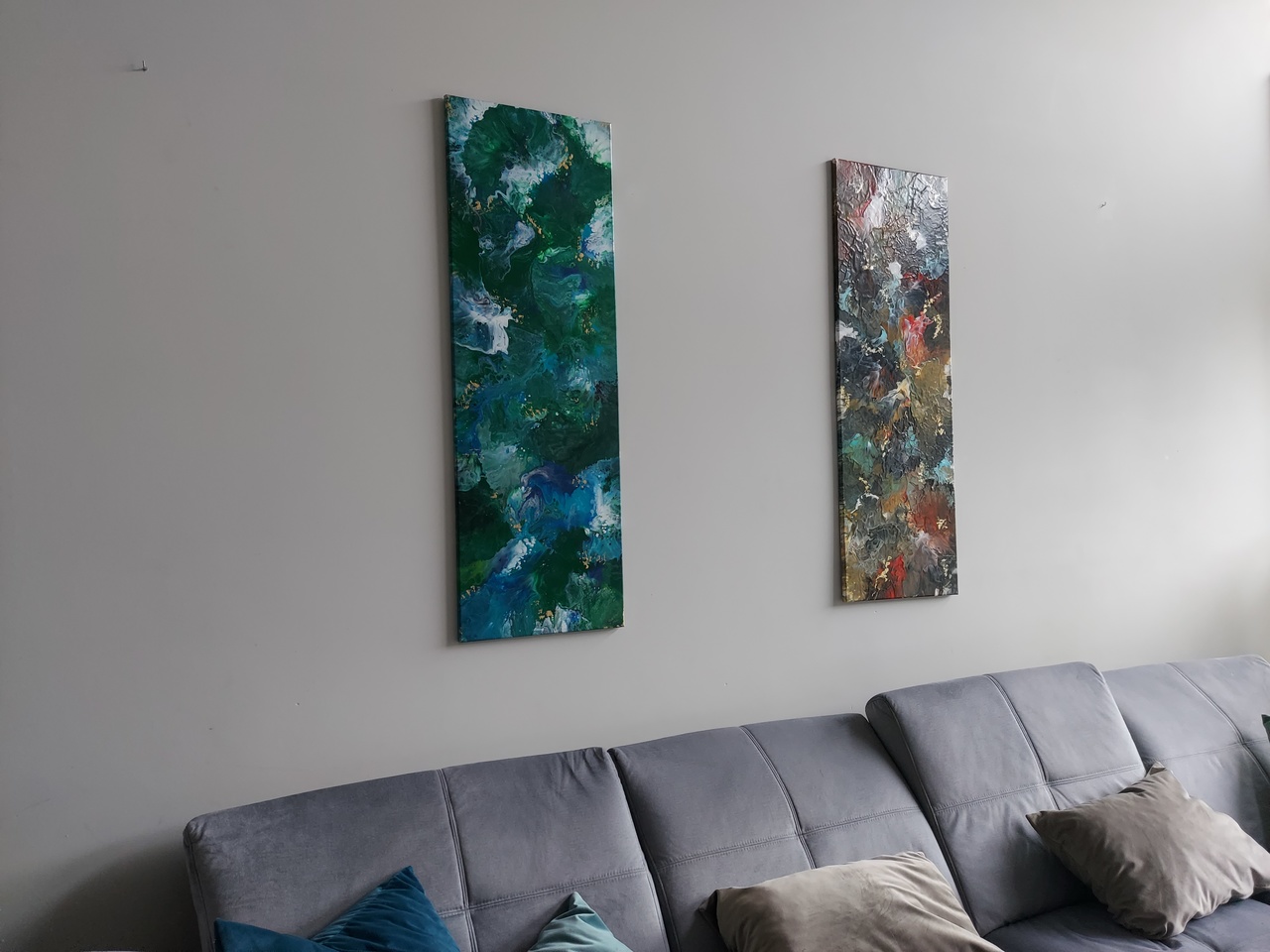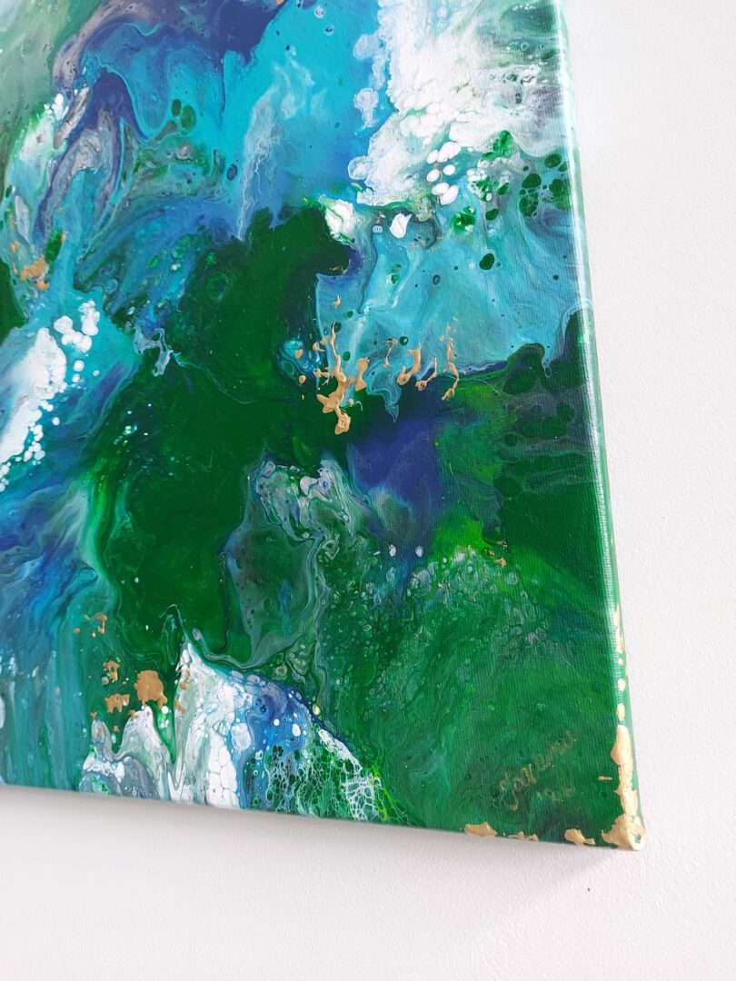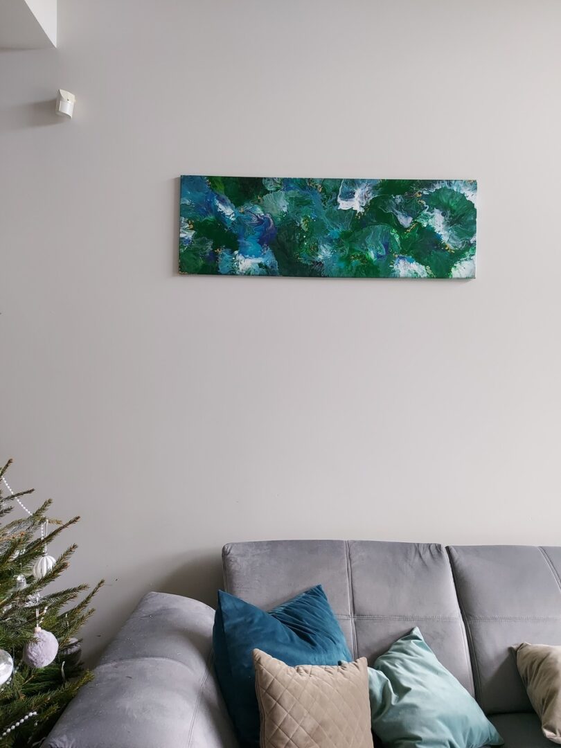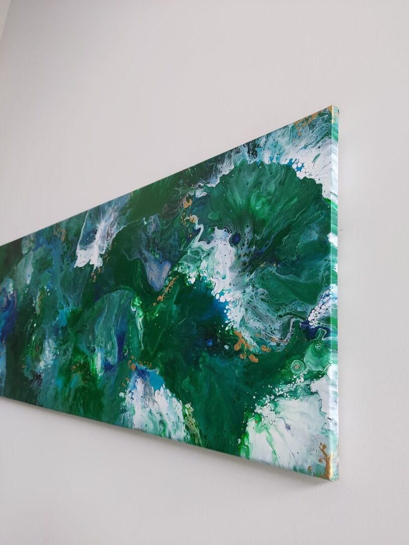 Abstrakcja na płótnie o wymiarach 40cm x 120cm x 1,5cm wykonana farbami akrylowymi w kolorach zieleni, niebieskiego i białego, ozdobiona odrobiną koloru złotego. Na instagramie można obejrzeć film przedstawiający ten obraz bardziej realnie. Gotowy do zawieszenia w pionie lub poziomie.