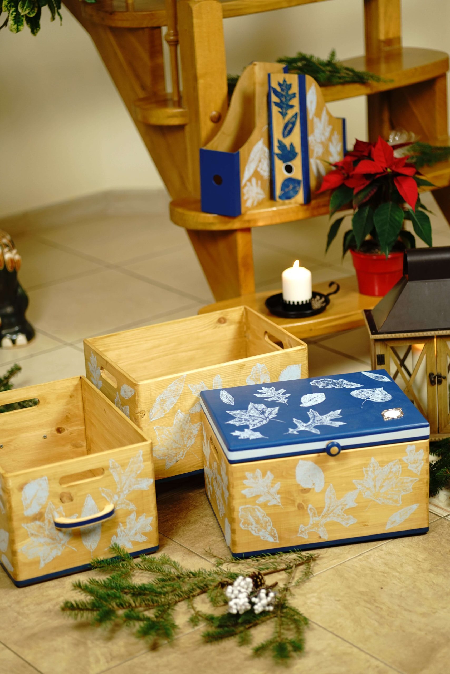 Piękna drewniana komoda/wózek na kółkach 3 częściowy. Zimowe barwy, na bazie bejcy w kolorze jasny dąb, liście w kolorze błękitu oraz granatu, ozdobny szyld w srebrnym kolorze na wieku, dodatkowe boczne uchwyty dla łatwiejszej mobilności komody. Wymiary: wys.75cm, gł.30cm, szer.40cm + 6cm rączki. Na zamówienie możliwość namalowania w innej kolorystyce lub wzorze. Termin do 10 dni roboczych.