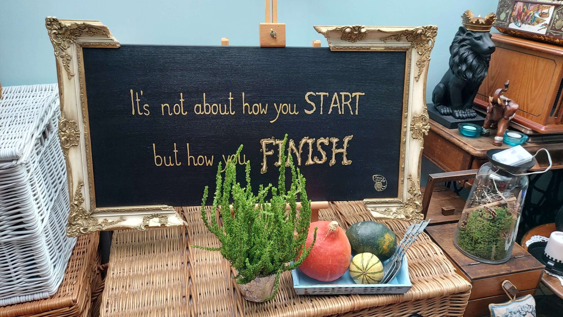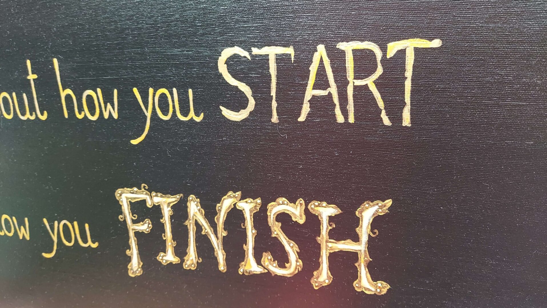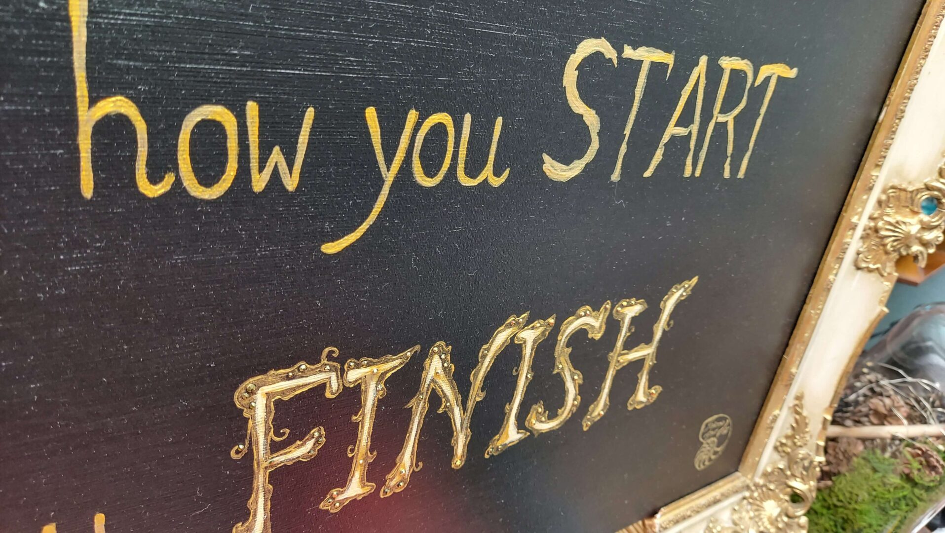 Obraz w pięknej starej złotej ramie stylizowany na starodawny. Tekst w tłumaczeniu na polski „Nieważne jak zaczynasz, ważne jak kończysz”. Wymiary samego obrazu 40cm x 80cm. Obraz malowany farbami akrylowi i ozdabiany kamieniami Swarovskiego.