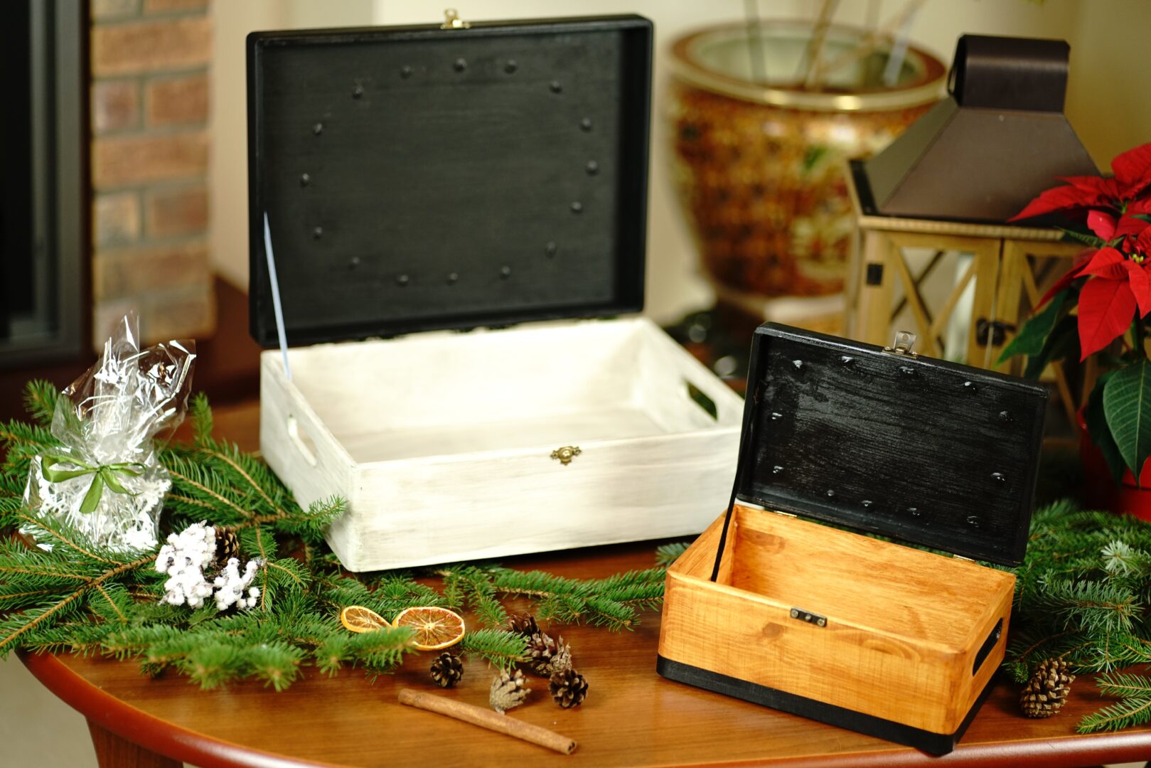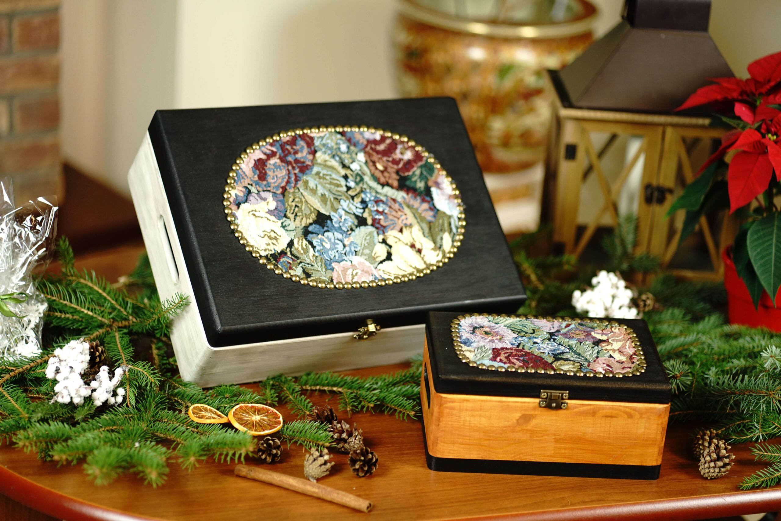 Nietuzinkowe szkatuły z drewna, malowane farbami akrylowymi i lakierobejcą w kolorze białym postarzanym oraz teak. Górna część szkatułek ozdobiona żakardowym materiałem w kwiaty oraz wykończona ozdobną listwą w kolorze starego złota. Wymiary szkatuł : średnia 30cmx40cmx14cm , mała 16cmx25,5cmx12cm.